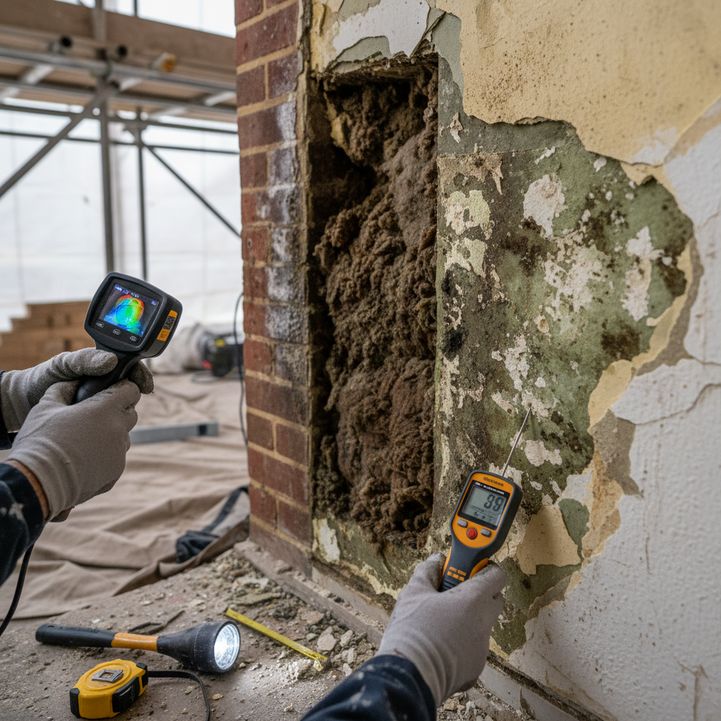Vor jeder Sanierung zählt die Ursachenfindung: "Drüberstreichen" vertuscht nur Symptome und führt zu Rezidiven. Moderne Messtechnik wie Calciumcarbid-Methode (CM-Messung) quantifiziert Feuchtegehalt genau (Genauigkeit ±1 %)[7]. Widerstandsmessung (z. B. Tramex) und Thermografie lokalisieren Wärmebrücken und Undichtigkeiten[10]. Endoskopie prüft Hohlräume auf Feuchte und Schäden[10].